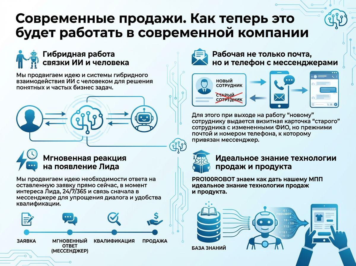 Сегодня начинаем серию статей как же будут теперь строиться продажи в новых ИИ-компаниях и тех компаниях, которые захотят выжить и не попасть на свалку истории. То, что описано ниже - это идеи целой идеологии, которую продвигаю я и PRO100ROBOT. Технология авторская, моя, я ее создал для себя, так мы продаем в PRO100ROBOT и довольно удобно продаем, без живых менеджеров по продажам. Конечно эта технология будет так или иначе меняться в каждой отдельной компании, но я поделюсь с Вами тем, что работает у нас, уверен, будет работать и у Вас как универсальное решение для любой ниши и компании любого размера. Главное - не сопротивляйтесь).