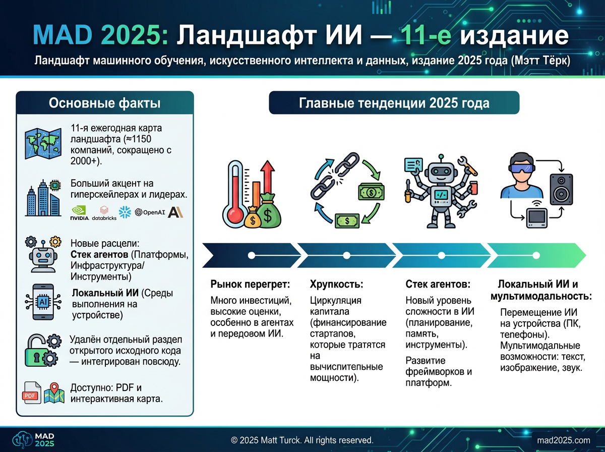Привет, друзья. Каждый год Мэтт Тёрк из FirstMark Capital выпускает свой знаменитый ландшафт MAD — Machine Learning, AI & Data. В 2025 году вышла уже 11-я версия, и это, пожалуй, самая переработанная карта за всё время. Автор сократил количество компаний с более чем 2000 до примерно 1150, чтобы всё было читаемо, и сделал акцент на реальных лидерах рынка: NVIDIA, Databricks, Snowflake, OpenAI, Anthropic и других гиперскейлерах. Перевел и сжал, выделиы главное для быстрого получения информации её для Вас. Оригинал статьи автора по ссылке.