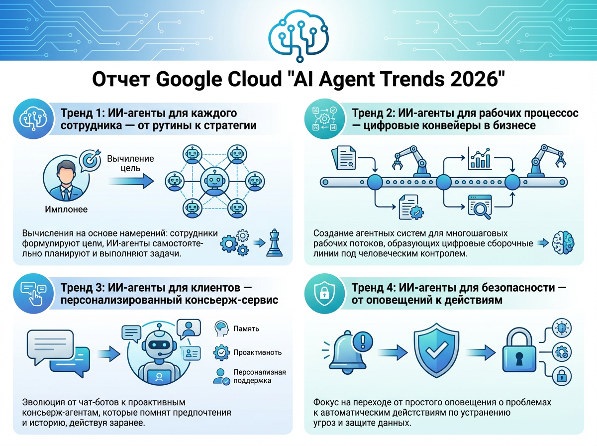 Привет, друзья. Отчет Google Cloud "AI Agent Trends 2026" раскрывает пять ключевых трендов в развитии ИИ-агентов, основанных на анализе данных от опроса 3466 руководителей предприятий по всему миру, а также интервью с экспертами из Google DeepMind и клиентскими кейсами. Эти тренды включают: агенты для каждого сотрудника (повышение индивидуальной продуктивности), для рабочих процессов (создание цифровых конвейеров), для клиентов (консьерж-сервис), для безопасности (автоматизация угроз) и для масштаба (обучение персонала). Агенты переходят от простых ответов на вопросы к планированию и выполнению задач под человеческим контролем, что меняет бизнес от эффективности к фундаментальной трансформации ролей и рабочих потоков..